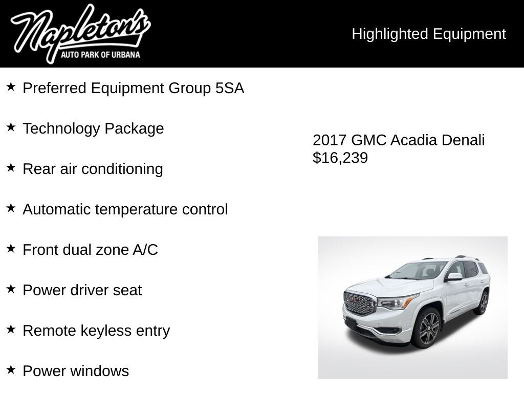 Discover the perfect blend of style, technology, and capability in the 2017 GMC Acadia Denali. This exceptional SUV is a true reflection of your discerning taste and active lifestyle. Visit our showroom today to experience the Acadia Denali firsthand and explore the possibilities of owning this remarkable vehicle.