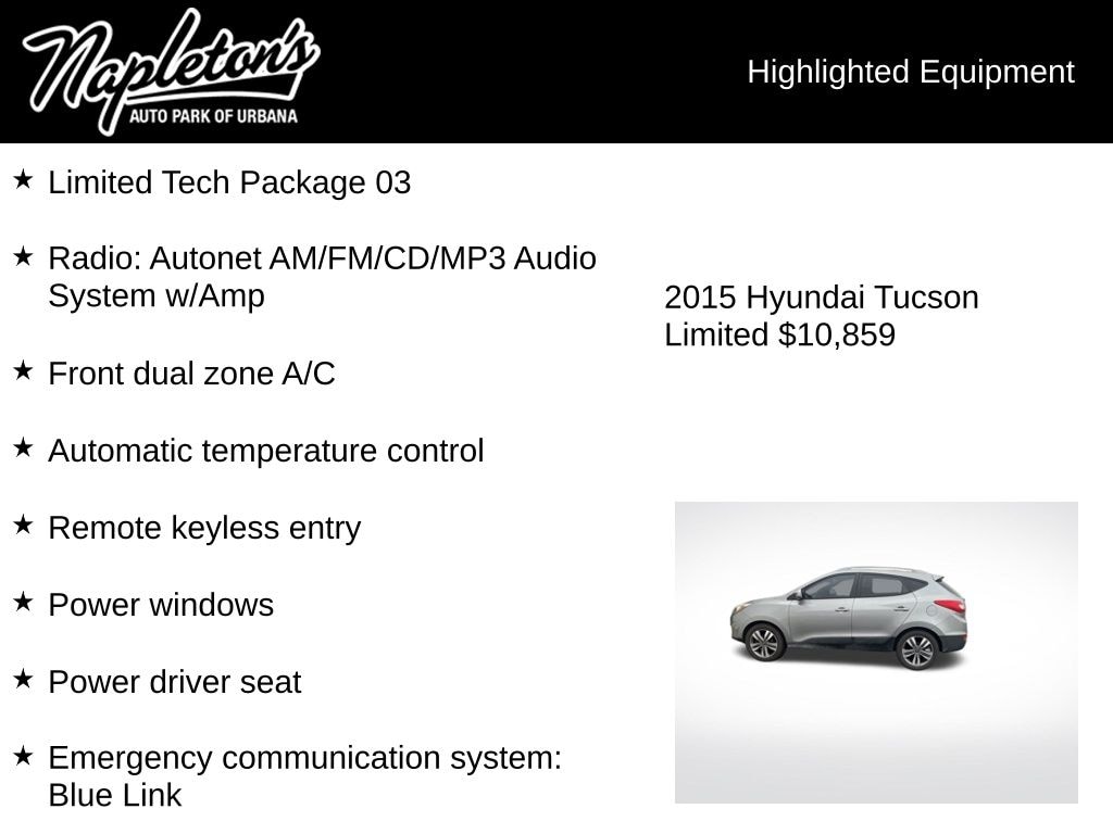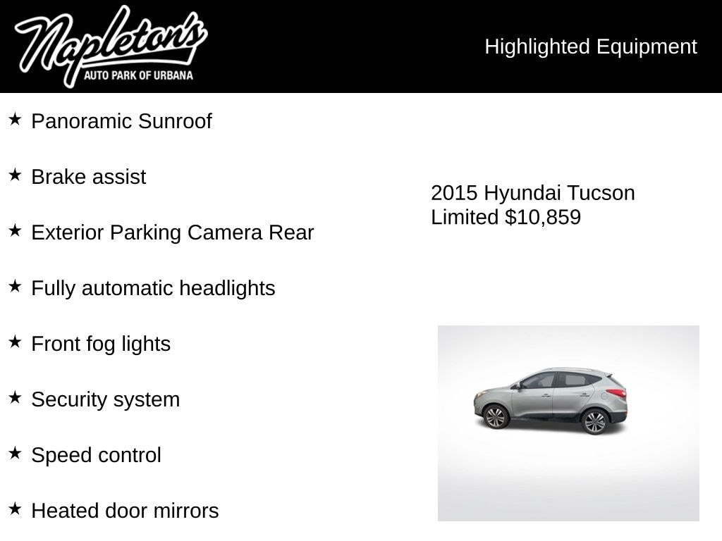 Don't miss your chance to experience the ultimate in SUV luxury and technology. This 2015 Hyundai Tucson Limited is waiting for you at our dealership, and we're confident it will exceed your expectations. Schedule a test drive today and discover the difference for yourself.