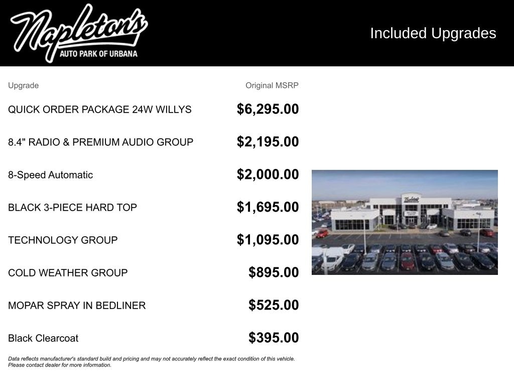 Designed for the ultimate in off-road capability, the Gladiator Willys boasts a rugged Black 3-Piece Hard Top, Black Grille, and MOPAR Spray-In Bedliner. The Willys package also includes the Convenience Group, Cold Weather Group, and Technology Group, ensuring you have all the features and comforts you need for both on and off-road adventures.