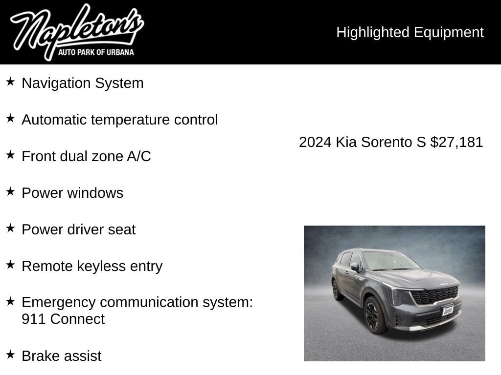 The Sorento S is powered by a potent 2.5L I4 DGI DOHC 16V LEV3-SULEV30 engine, delivering an impressive 191 horsepower and paired with an 8-speed automatic transmission. With its advanced All-Wheel Drive system, you'll enjoy confident handling and traction in all driving conditions.