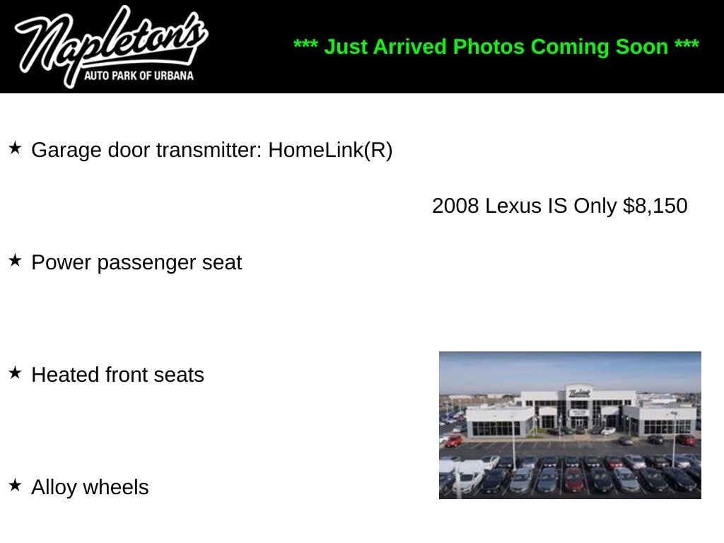 Don't miss your chance to own this exceptional 2008 Lexus IS 250 with the Navigation System and Mark Levinson Premium Audio Package. Visit our showroom today and let us help you experience the true meaning of luxury and performance.
